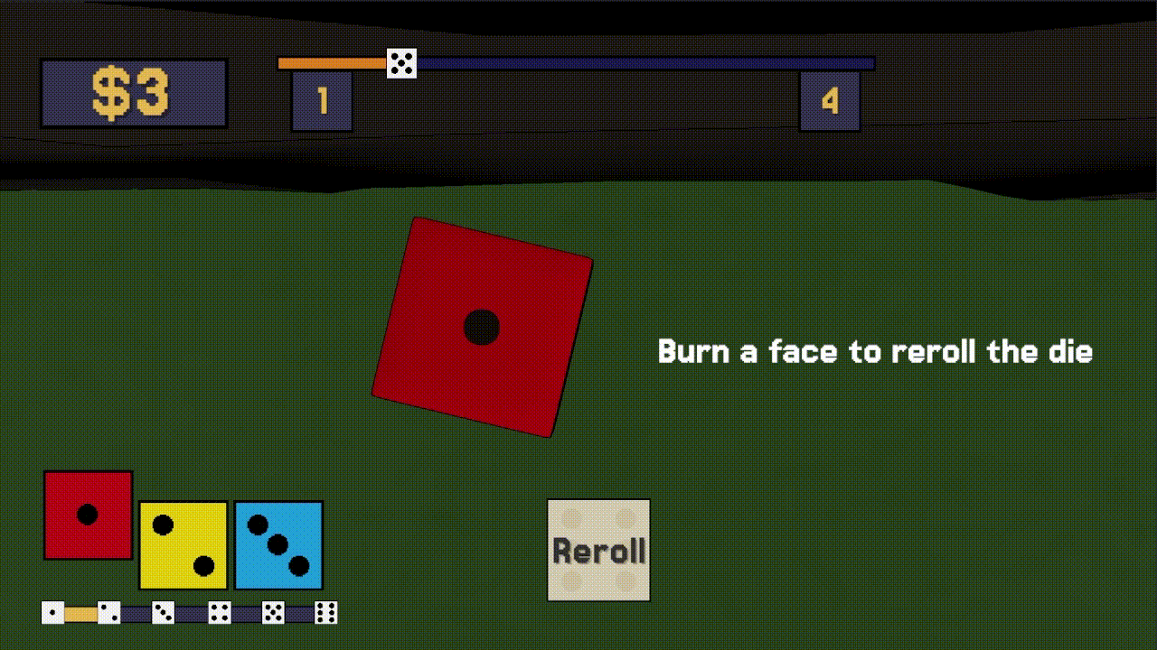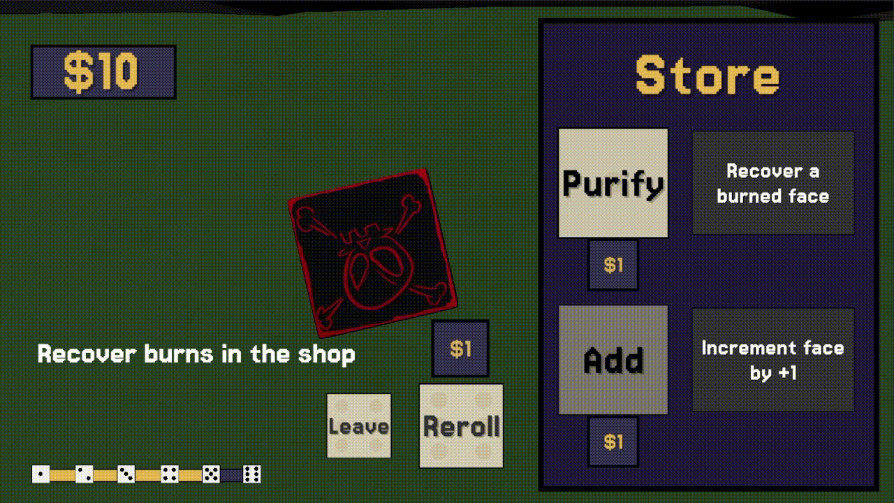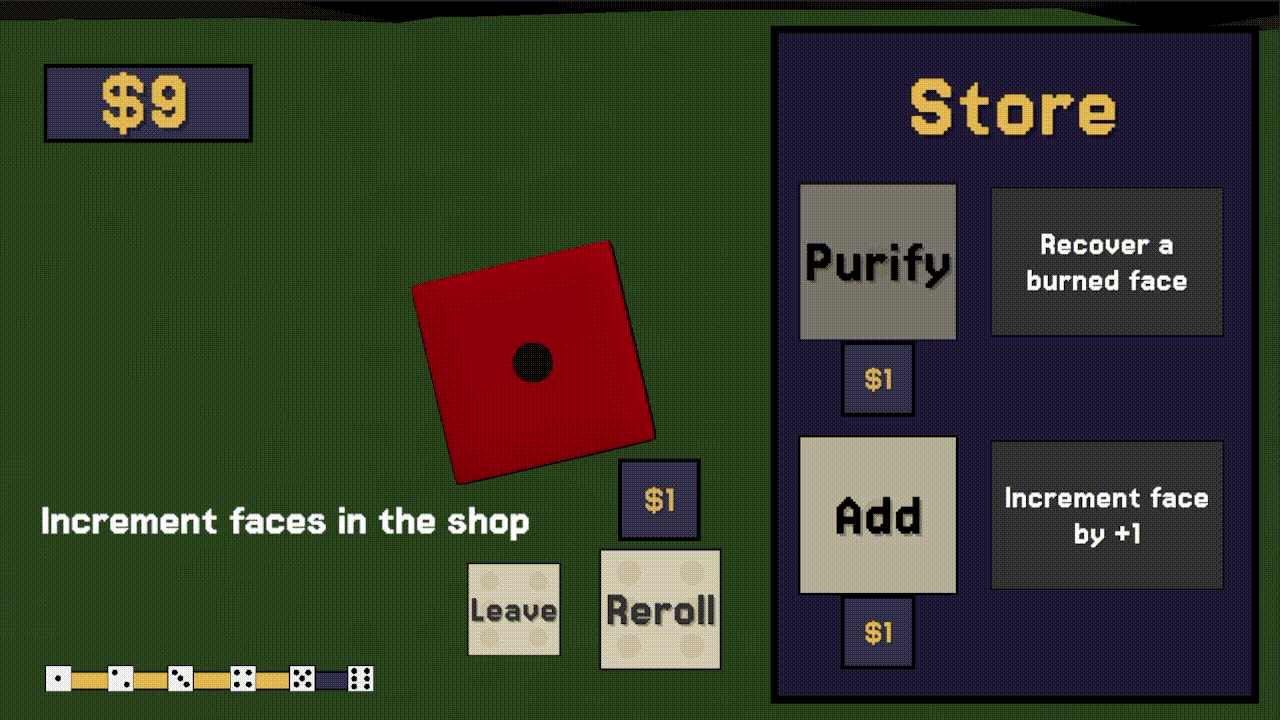 In the shop, upgrade your dice to increase your odds or purify a cursed face.